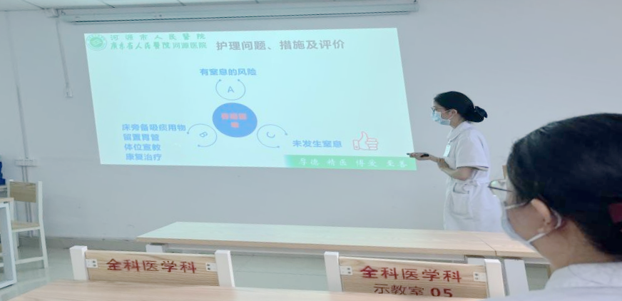 为进一步提高临床教学质量及带教老师整体素质,拓宽查房内涵,提升护理实习生解决临床护理问题的能力,7月21日下午,护理部在全科医学科开展“一例鼻咽癌放疗后吞咽障碍患者的护理”为主题的教学查房。本次查房由全科医学科护士长赖海燕主持,全科医学科及老年医学科护理实习生参与,并邀请了护理部副主任袁秋影、黄松彬以及大内科护士长黄燕琴现场指导。内科片区护理教学骨干及护理实习生约20余人观摩了此次教学查房。