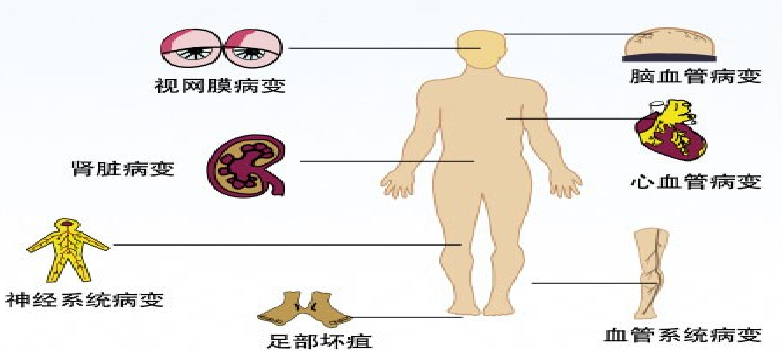 并发症:糖尿病是一种长期慢性疾病,常见慢性并发症有糖尿病视网膜病变、糖尿病肾病、糖尿病性神经病变、糖尿病性下肢动脉病变、糖尿病足等,甚至导致心脏病、脑中风等并发症。