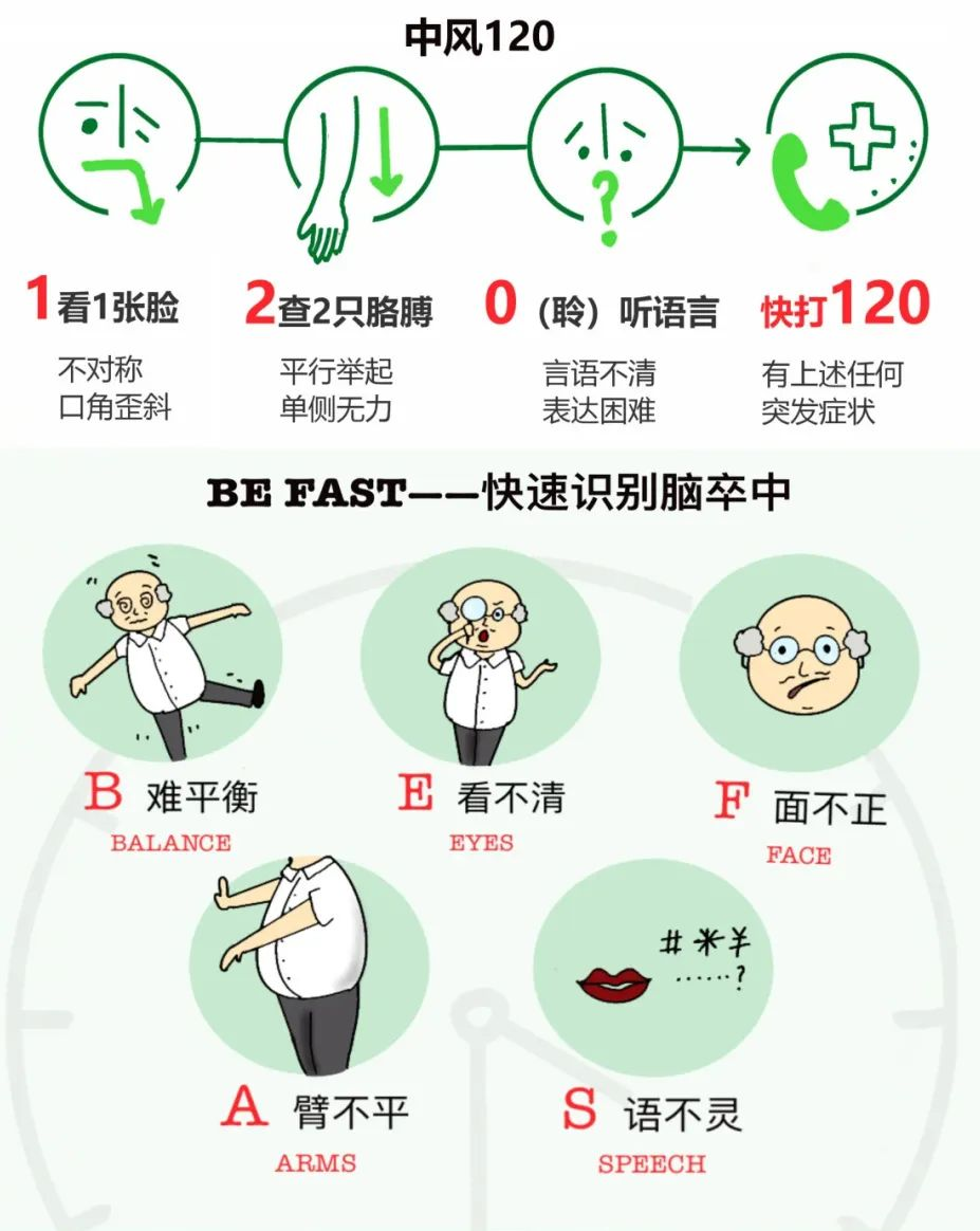 “中风120”和“BE FAST”口诀是适用于民众的可迅速识别脑卒中和即刻行动的策略。