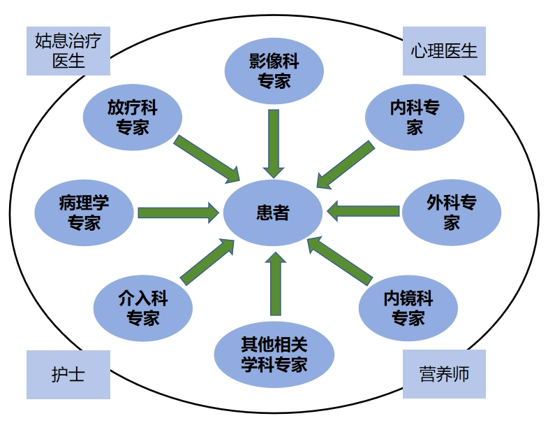 肿瘤多学科团队(multi-disciplinary team, MDT),指多个学科人员合作组成团队共同为病人制定整体化、个性化的治疗方案,继而由相关学科单独或多学科联合执行的诊疗措施。MDT可以避免单一学科在疾病认识过程中的片面性,达到各学科相互融合,在诊疗技术、方法、理念上达成共识,提高疾病的治疗效果。同时,MDT的一站式医疗服务,缩短了患者在单科排队、重复挂号、缴费等事务上的等待时间,提高了就医效率,在一定程度上降低了诊疗费用,为病患减轻了负担。