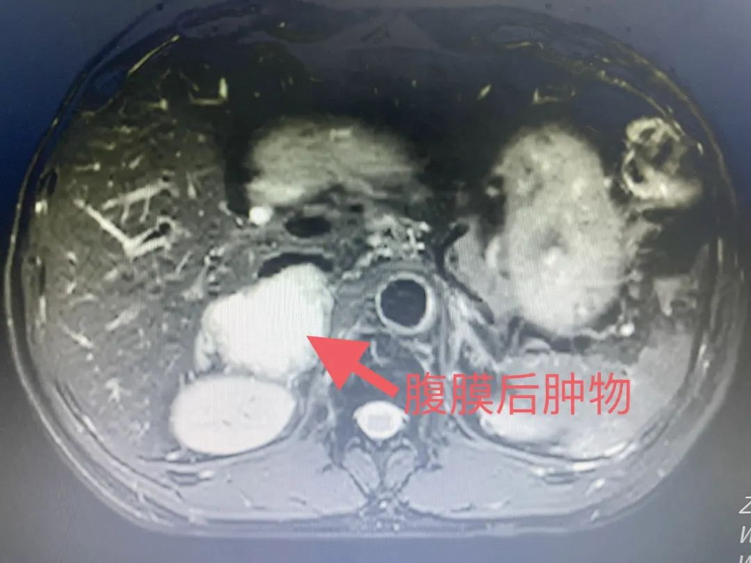 ▲下腹部MRI增强扫描提示右侧腹膜后巨大肿物