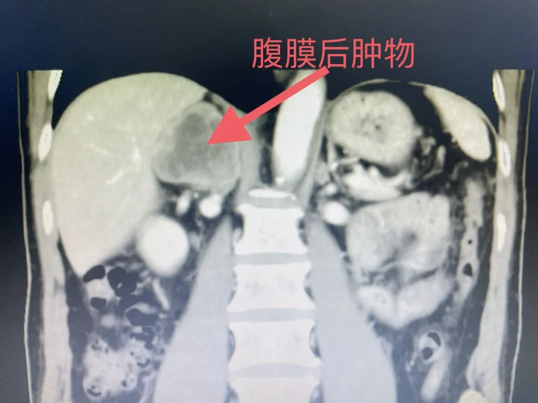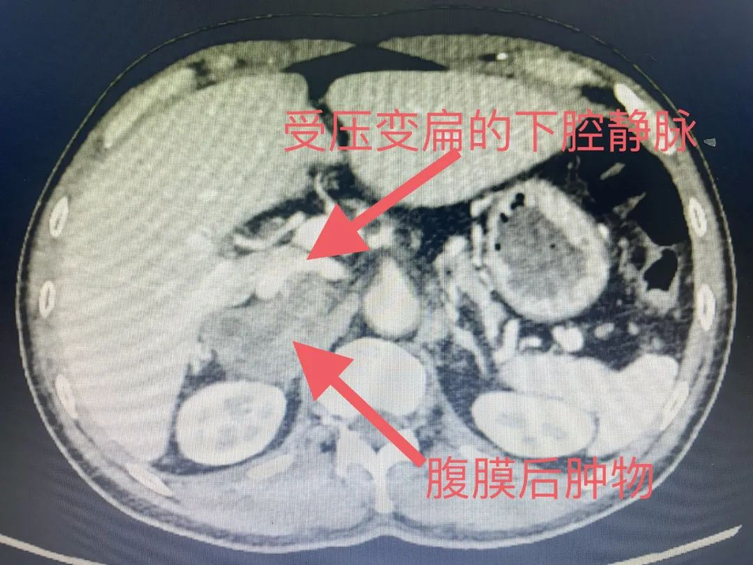 ▲下腹部增强CT提示肿物位于腹膜后深部,肝脏内侧缘