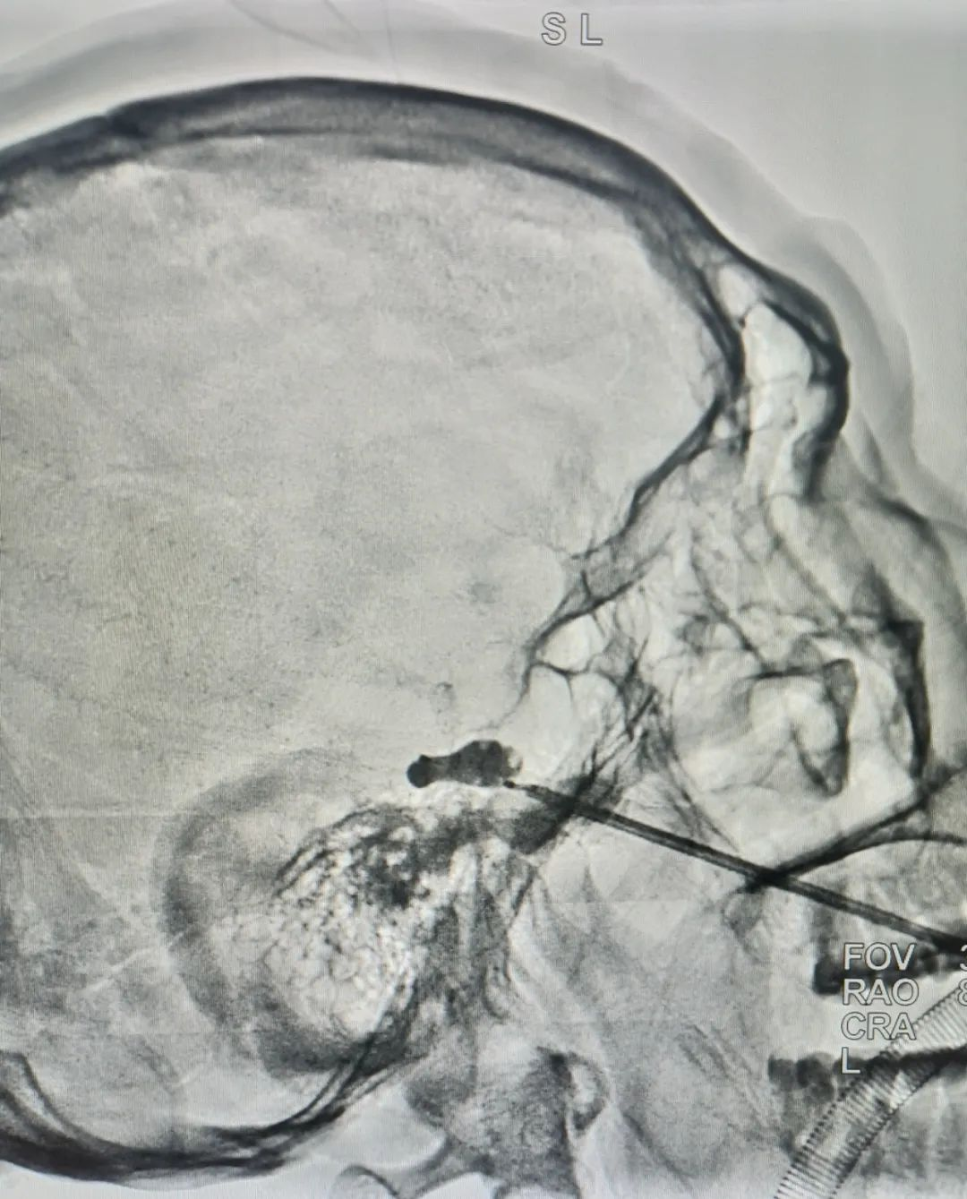 患者叶某,男性,今年50 岁,患有三叉神经痛多年,长久以来饱受疼痛折磨。近半个月来,患者自觉发作次数较前增多,持续时间较前延长,患者既往就诊于多家医院行药物、理疗及神经阻滞术,疼痛未见明显缓解。为求进一步诊治,遂就诊于我院麻醉疼痛科,入科后疼痛组彭思进主任医师对患者做了全面的情况了解,随即彭思进主任医师组织疼痛小组团队进行详细的术前讨论,经过反复商酌,决定为患者实施“经皮穿刺左侧三叉神经半月神经节球囊压迫术”治疗。