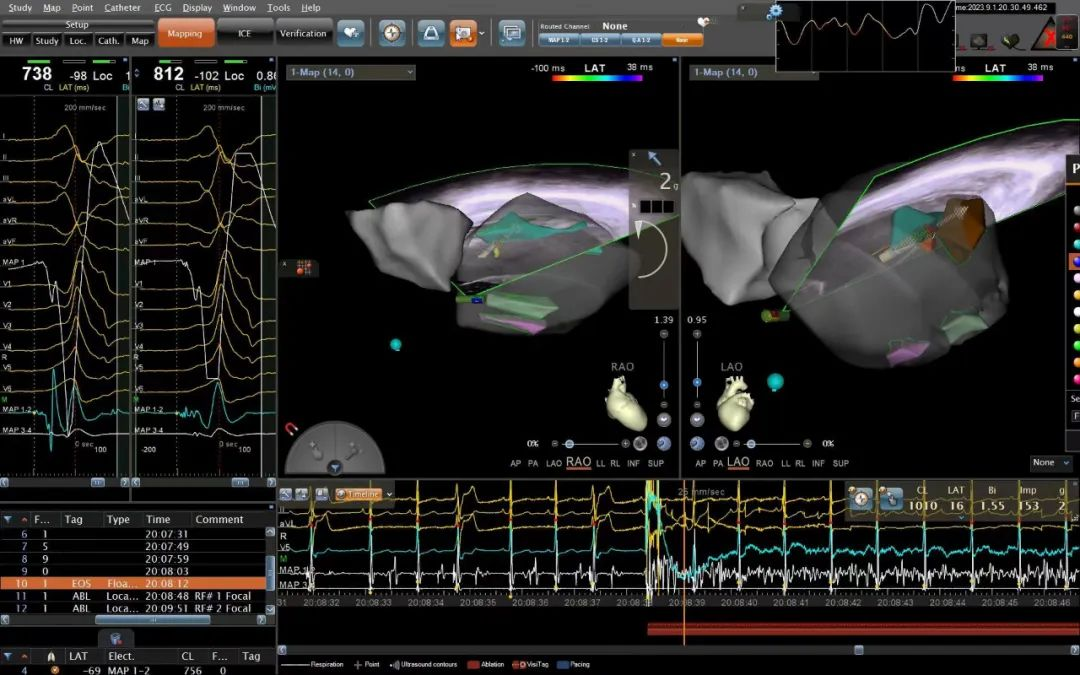 手术当日,心血管内科三区张进鹏主任、唐亮副主任使用ICE导管精准的构建出左心室及左室乳头肌模型后,运用消融电极导管进行激动标测,在ICE构建出的左室乳头肌前组上找到激动最早点,单极电位非常满意,进行放电消融,放电之后早搏即刻消失,随后进行巩固放电,经反复静滴异丙肾上腺素及电刺激无法再诱发,手术成功,手术全过程未使用X射线透视,实现了绿色电生理。术后复查动态心电图提示室性早搏消失,患者痊愈出院。