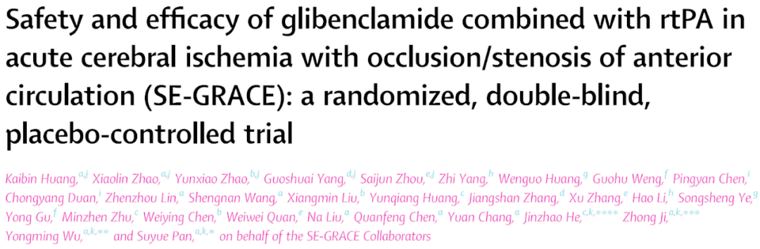 近日,我院何锦照副院长带领的神经内科科研团队作为主要分中心单位参与的多中心临床研究在Lancet子刊eClinicalMedicine(JCR分区:1区,IF:15.1)上发表题为“Safety and efficacy of glibenclamide combined with rtPA in acute cerebral ischemia with occlusion/stenosis of anterior circulation (SE-GRACE): a randomized, double-blind, placebo-controlled trial”的临床研究成果。我院何锦照副院长为联合通讯作者之一,黄运强副主任医师和朱敏真副主任医师是研究贡献作者之一。