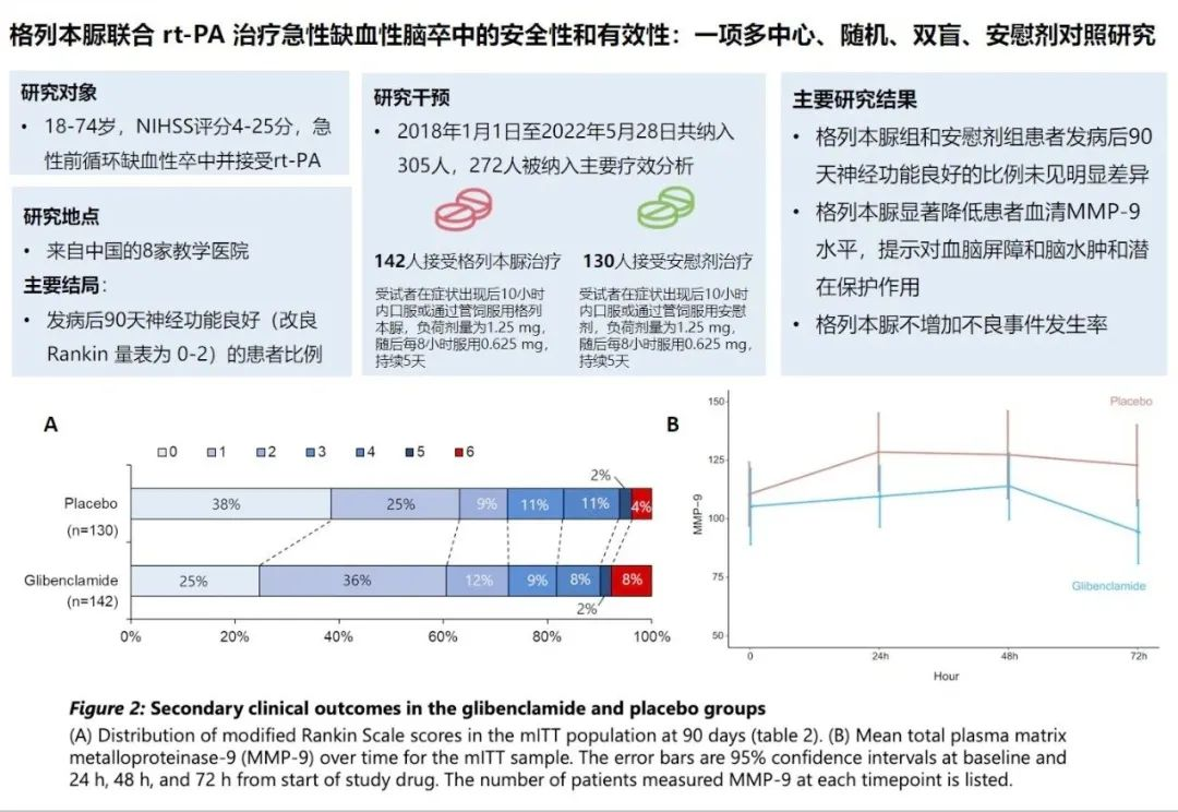 该临床研究为南方医科大学南方医院神经内科潘速跃教授团队组织开展的脑水肿发生机制及防治的转化研究。潘速跃教授团队前期在动物实验充分证实格列本脲通过阻断SUR1-TRPM4通道减轻脑水肿和神经炎症从而在急性脑损伤中起到多效保护作用,并通过探索性研究发现口服格列本脲在急性缺血性卒中患者中具有良好耐受性。基于上述研究结论,潘速跃教授团队牵头发起了一项口服格列本脲联合rtPA治疗急性缺血性卒中的多中心、随机、双盲、安慰剂对照研究,该项研究结果显示,尽管口服格列本脲未能改善受试者神经功能结局,但降低了患者血清中血脑屏障损伤和脑水肿相关指标MMP-9的水平。