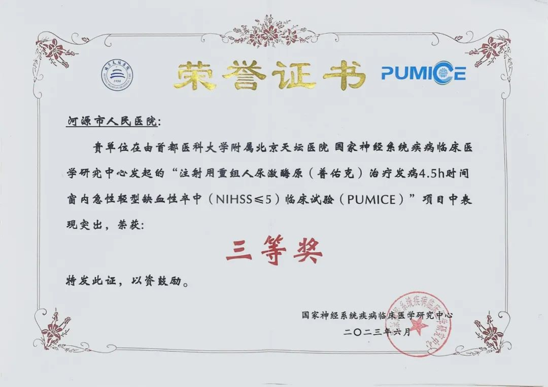 何锦照副院长指出:我院神经内科作为广东省临床重点专科,秉承“科研、教学、临床“三位一体全面发展的原则,以“高级卒中中心”作为引领,在卒中领域不断开拓创新。除上述研究成果外,目前我院参与国家神经系统疾病临床医学研究中心项目2项,其中“注射用重组人尿激酶原(普佑克)治疗发病4.5h时间窗内急性轻型缺血性卒中 (NIHSS≤5) 临床试验——多中心、前瞻性、随机、开放标签、终点盲法临床试验”荣获项目三等奖。我院神经内科将继续奋发图强,充分把握高水平医院建设的机遇,全面提高神经内科临床和科研水平,在推动河源地区神经内科专科全面发展的道路上不断前行。
