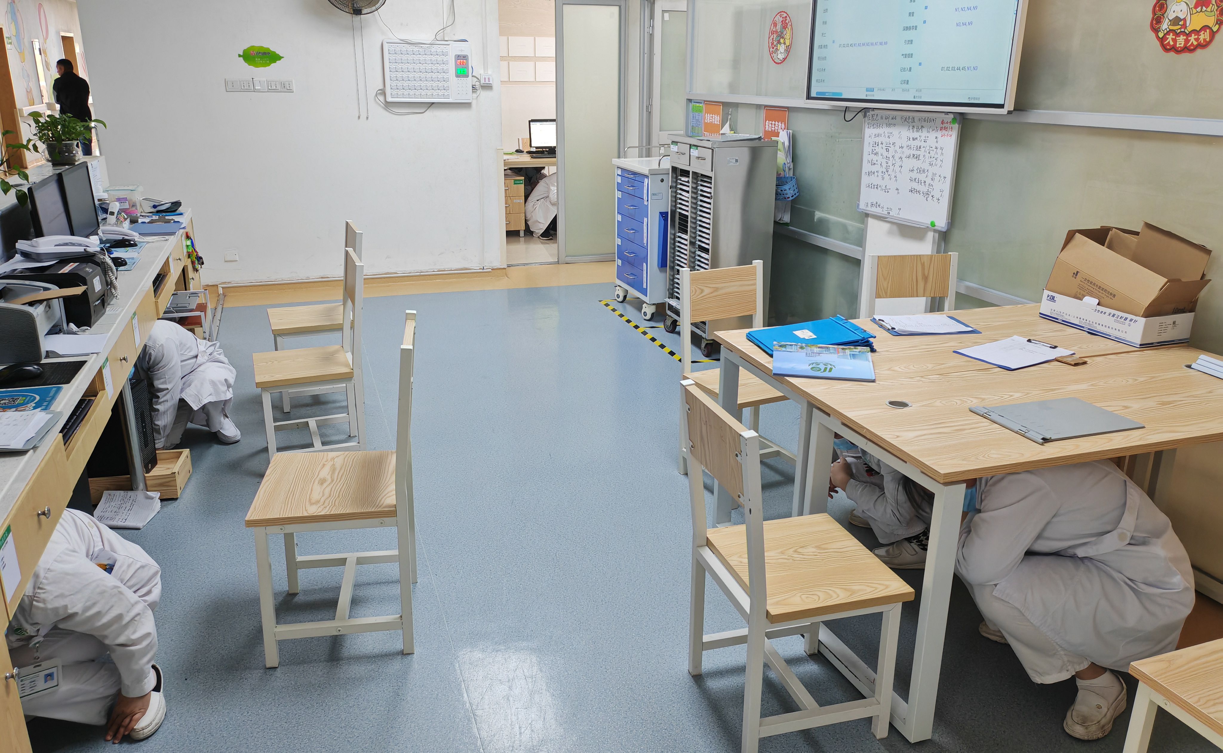 1、地震发生,进入紧急避险状态。全体医护人员、患者及家属以最快速度就近躲避到桌下或床下,并用手紧握桌脚或床支架,行动不便的患者靠近墙角位置,保护头部及眼睛,避免受伤。