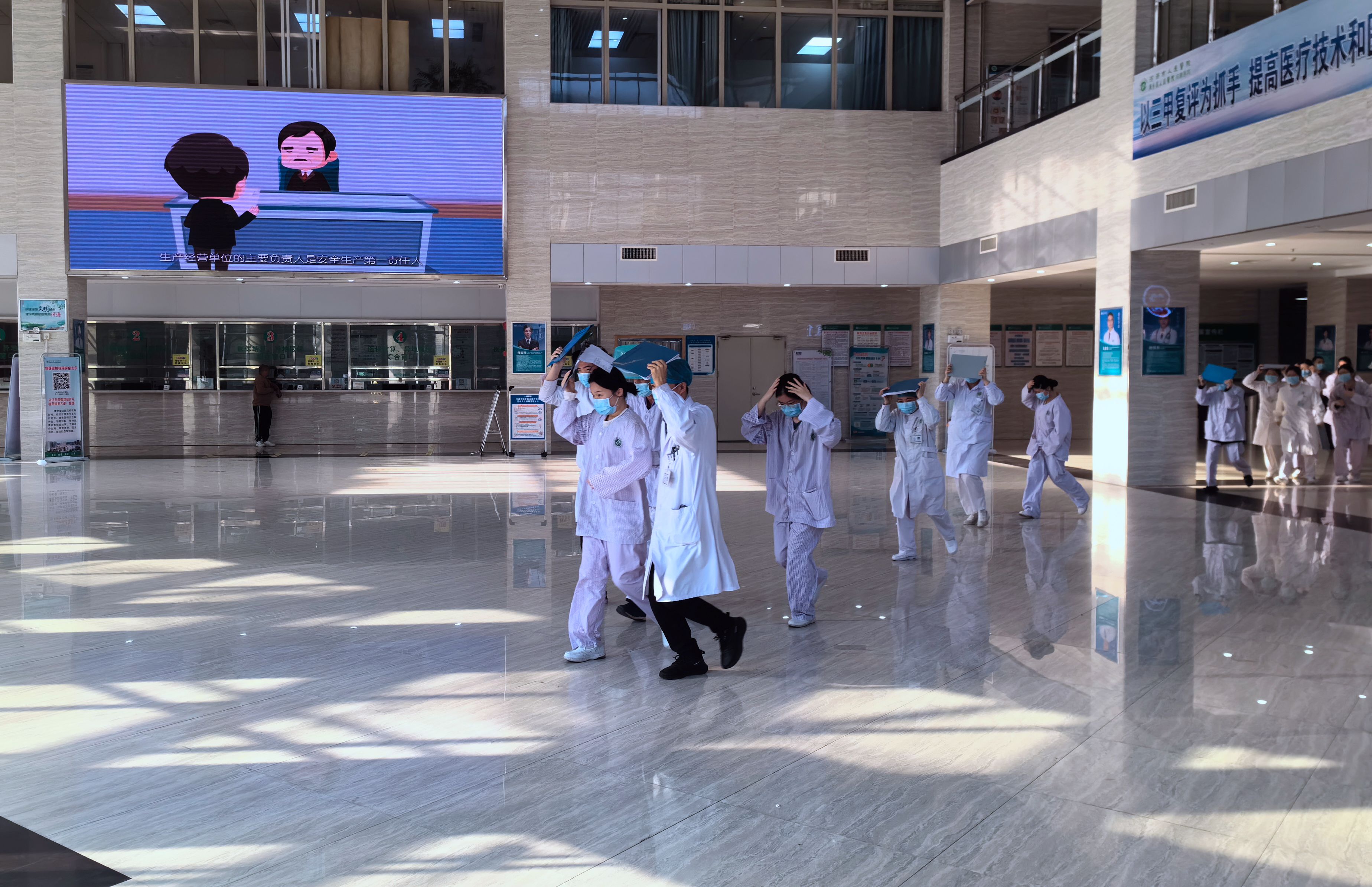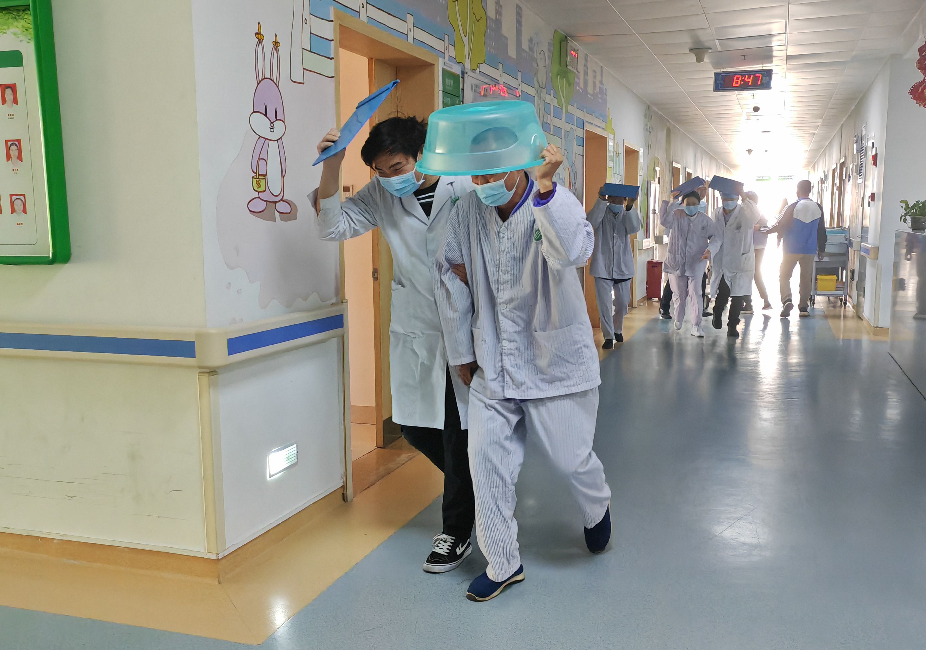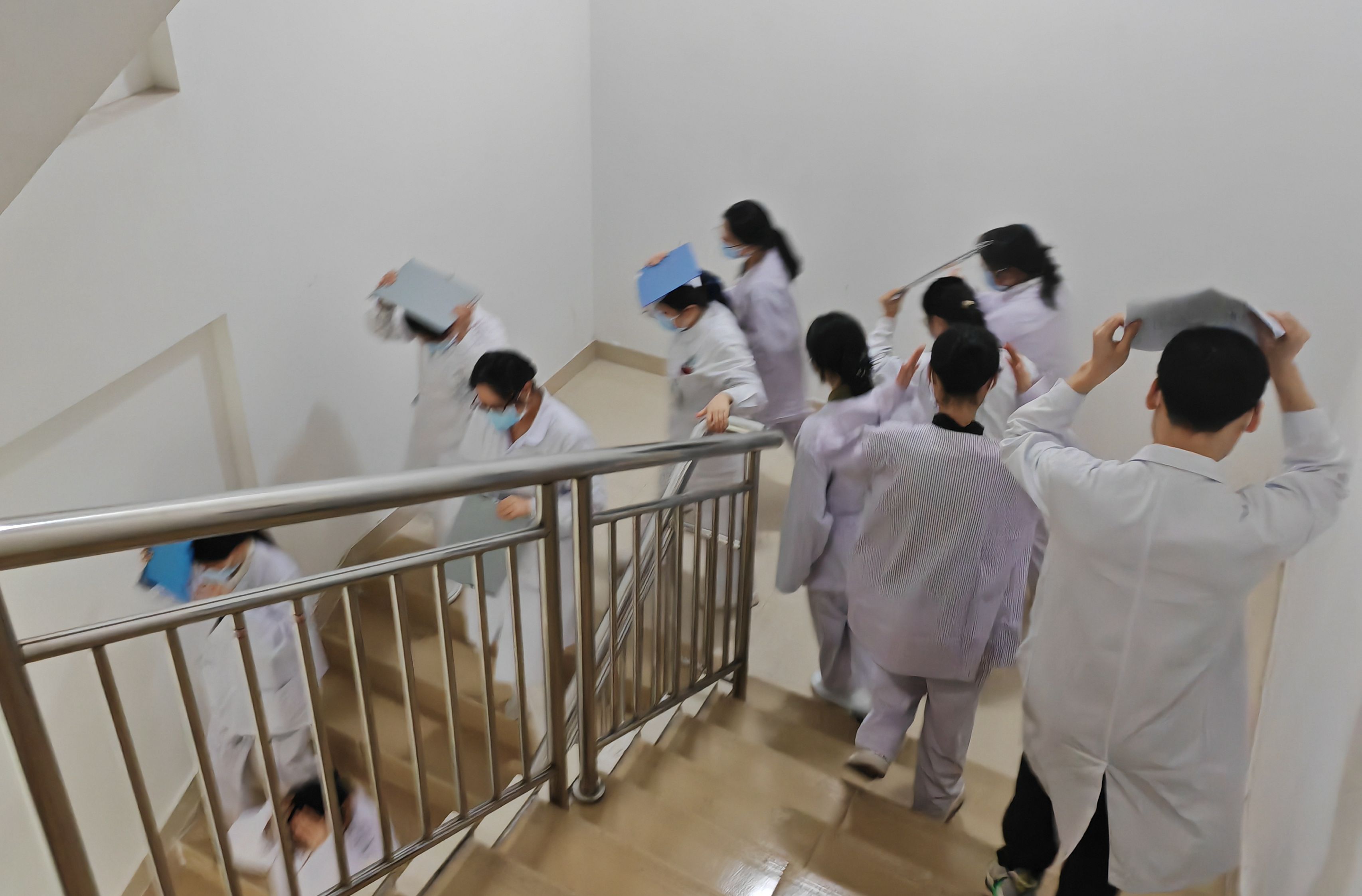 2、组织疏散。第一波地震结束,护士长按照《应急疏散预案》组织医护人员、患者及家属进行紧急疏散,所有人员就近拿起比较硬的东西将其举在头顶上,安全有序地从疏散通道撤离至空旷区域。