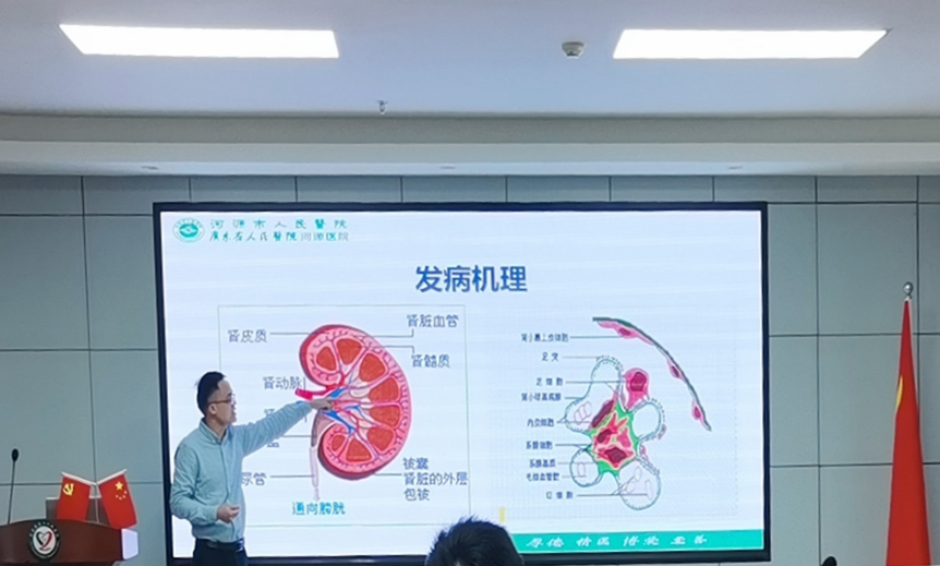 ▲肾内科一区主任廖安全讲授早期肾脏病的发病机理及诊治进展