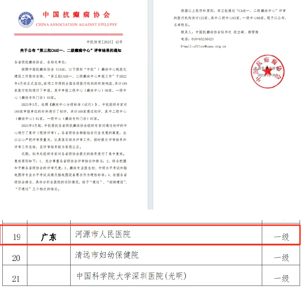 10月29日,中国抗癫痫协会(China Association Against Epilepsy, CAAE)公布了第三批一、二级癫痫中心评审结果,广东省人民医院河源医院癫痫中心,从全国189家医疗机构中脱颖而出,顺利通过评审,获批为一级癫痫中心,被纳入国家三级癫痫中心网络体系中,使我院又添一国家级专病防治中心。这一成就得益于我院坚实的专业技术实力和周密的准备工作;这次认证是中国抗癫痫协会对我院癫痫中心建设工作的肯定,体现了我院癫痫疾病综合诊治能力达到区域领先水平,标志着我院癫痫中心建设再上新台阶。