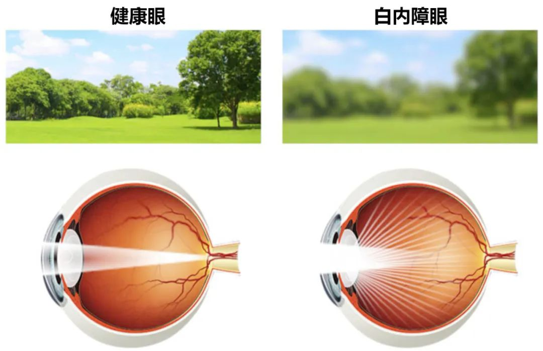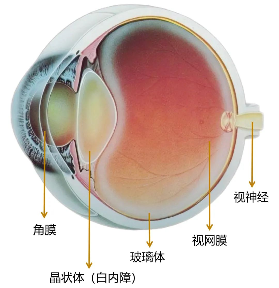 白内障位于瞳孔及虹膜后方。光线依次通过角膜、前房、瞳孔、晶状体和玻璃体到达视网膜,由视网膜将光信号传导至视神经,最后传导至大脑视觉中枢,形成清晰的图像。任何一道关卡的阻拦都会产生视物模糊,甚至视物不见。眼科医生通常喜欢将晶状体比喻为照相机的镜头,摘除白内障并植入人工晶状体就好比更换照相机镜头。