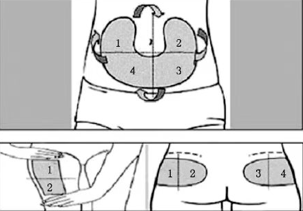 根据可操作性、神经及主要血管之间的距离、皮下组织的状况等,人体适合注射胰岛素的部位是腹部、大腿外侧、上臂外侧和臀部外上侧,如图所示。腹部边界如下:耻骨联合以上约1cm,最低肋缘以下约1cm,脐周2.5cm以外的双侧腹部;双侧大腿前外侧的上1/3;双侧臀部外上侧;上臂外侧的中1/3。
