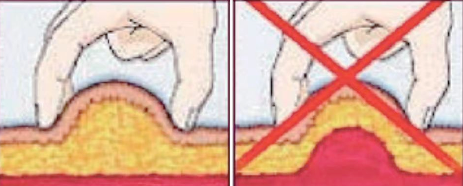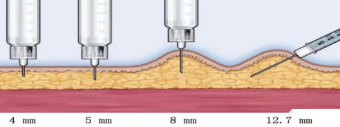 2.使用较长(≥6mm)的针头时,需要捏皮和(或)45°进针以降低肌内注射风险。