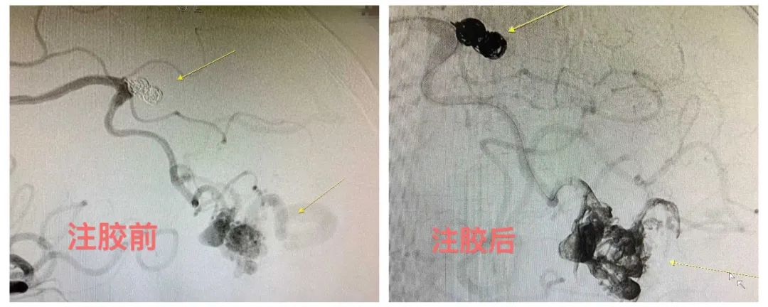 手术由我科客座教授陈光忠亲自主刀,术中先使用弹簧圈单栓动脉瘤,然后将漂浮导管送至动静脉畸形瘘口,采用液态材料栓塞。Marathon微导管精准到位后使用兼容的弹簧圈小心填塞A4动脉瘤,达到致密栓塞。然后微导管继续朝远端超选,精准到位动静脉畸形巢,使用液体栓塞材料弥散栓塞,畸形巢内动脉瘤被胶水填充后不再显影。因已达到止血治疗目的,按计划决定不再予更改通路栓塞其他供血动脉。术后患者无不适,恢复迅速,目前已顺利出院。