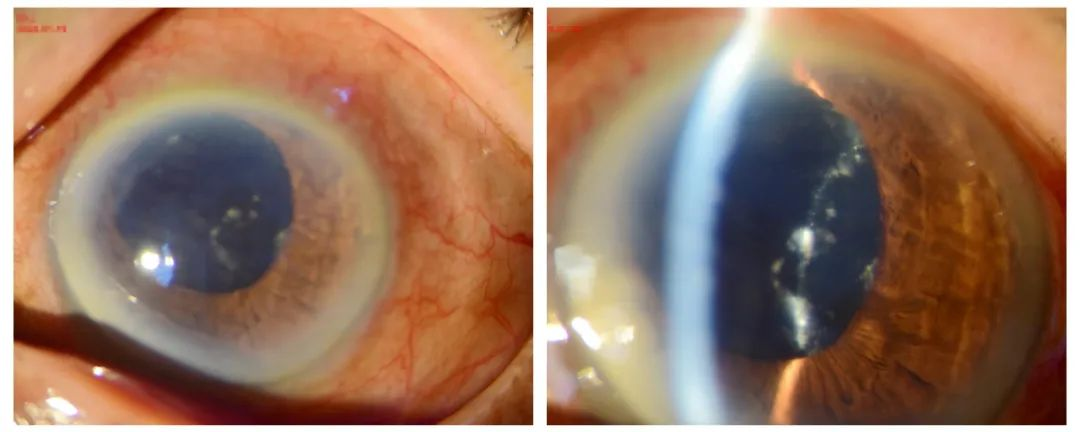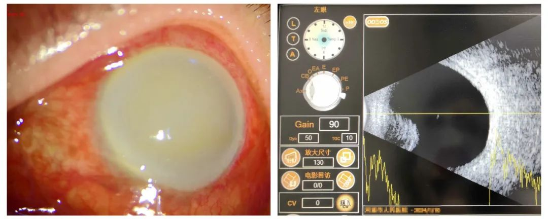 我们关注到患者的眼睑是正常的,结膜充血水肿的程度也和房水混浊度不对应,且无分泌物增多的症状,结膜囊内很干净。并结合眼部B超显示中段和后段玻璃体腔很干净,因此排除“感染性眼内炎”。眼科主任李仁芳关注到病人的年龄和眼部B超的表现,患者10余年前已因“白内障”在外院行了右眼白内障摘除+人工晶体植入术,且当时左眼白内障已“成熟”,只是由于左眼视力差且合并较严重的外斜视,故未行左眼白内障摘除术。李仁芳主任初步考虑该患者所患眼病为“晶状体溶解性青光眼”。