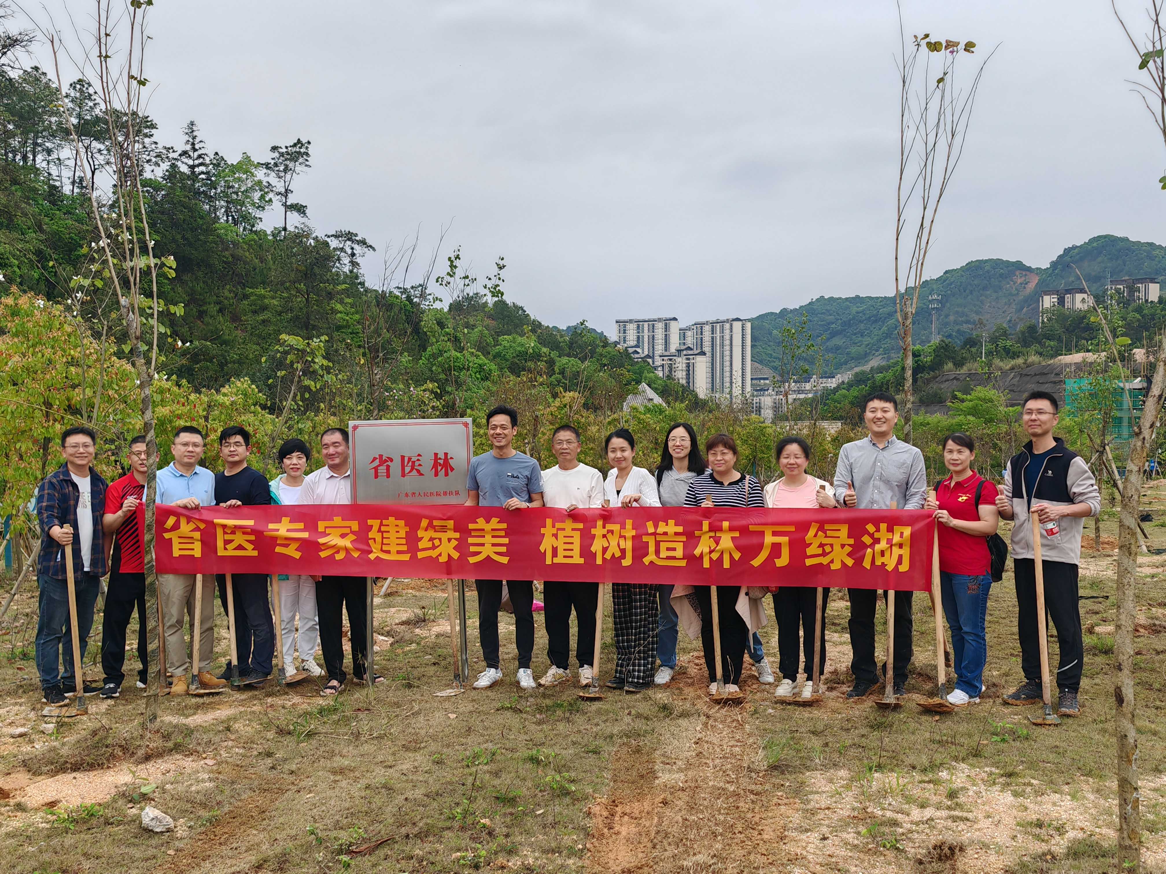 东源县委常委、新丰江林管局、万绿湖风景区党委书记邓小林,新丰江林管局副局长赖志东及新丰江林管局李志标科长等同志一同参与本次活动并给予大力支持,为活动精心挑选了树苗,准备了工具。在植树现场,广东省人民医院河源医院院长何鹏程带领省医专家队员们挥锹铲土、扶植树苗、培实新土,挖坑、培土、踩实土壤……大家分工明确又配合默契。