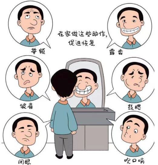 4.面训练。面部的护理是对白天治疗的强化,可以自己在家进行。
