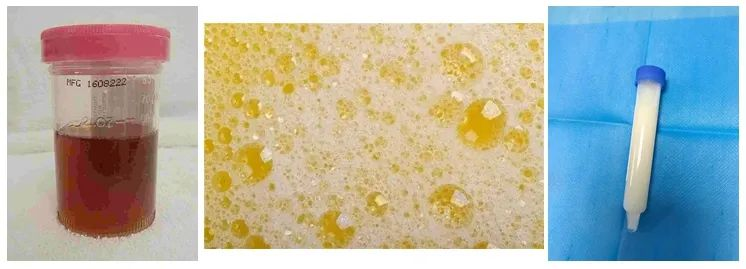 ▲红色尿液、泡沫尿及乳糜尿