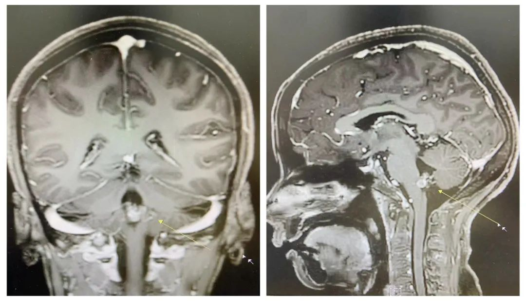 术后患者视物晃动、头痛症状明显缓解,术后恢复快,第二天即可下床活动,语言流利清晰,无吞咽困难,饮水呛咳等,无后遗症。得知成功摘除这个不定时炸弹,又没有后遗症,患者及家属都非常高兴。