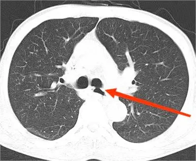 ▲术前胸部CT(箭头指向为气管食管瘘口)