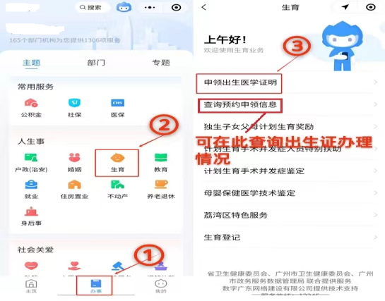 1.微信搜索登录“粤省事”小程序,选择“办事”,点击“生育”,选择“申领出生医学证明”。