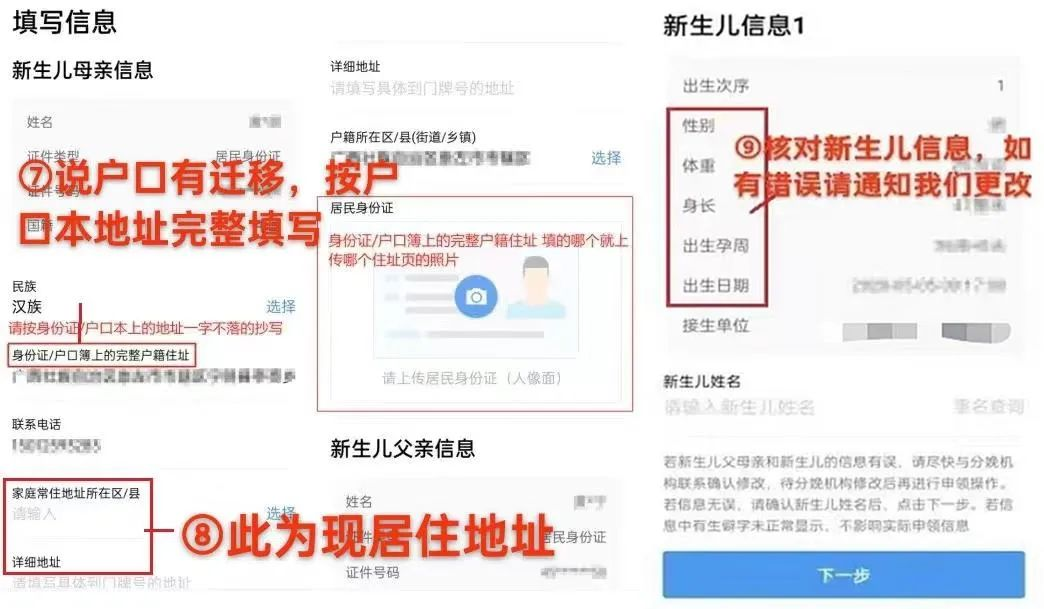4.按页面要求填写信息,点击“下一步”。温馨提示:如发现信息有误,请尽快与分娩机构联系确认修改。