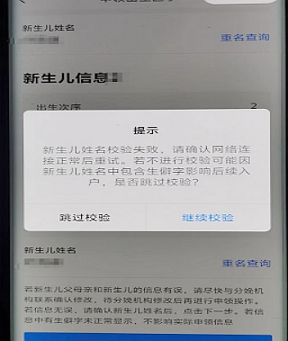 若点击“重名查询”时出现错误码“ECONNREFUSED”或新生儿姓名校验失败等报错,这可能是由于省公安厅数据接口正在维护中,暂时无法进行校验。此时,您可以点击“跳过校验”继续办理业务。