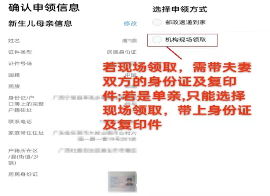 5.确认申领信息,并选择申领方式。如选择“邮政速递到家”,需要填写邮寄信息(选择父亲(双亲家庭)或母亲),并进行线上文件签署。签署完成后点击“确认并提交”。