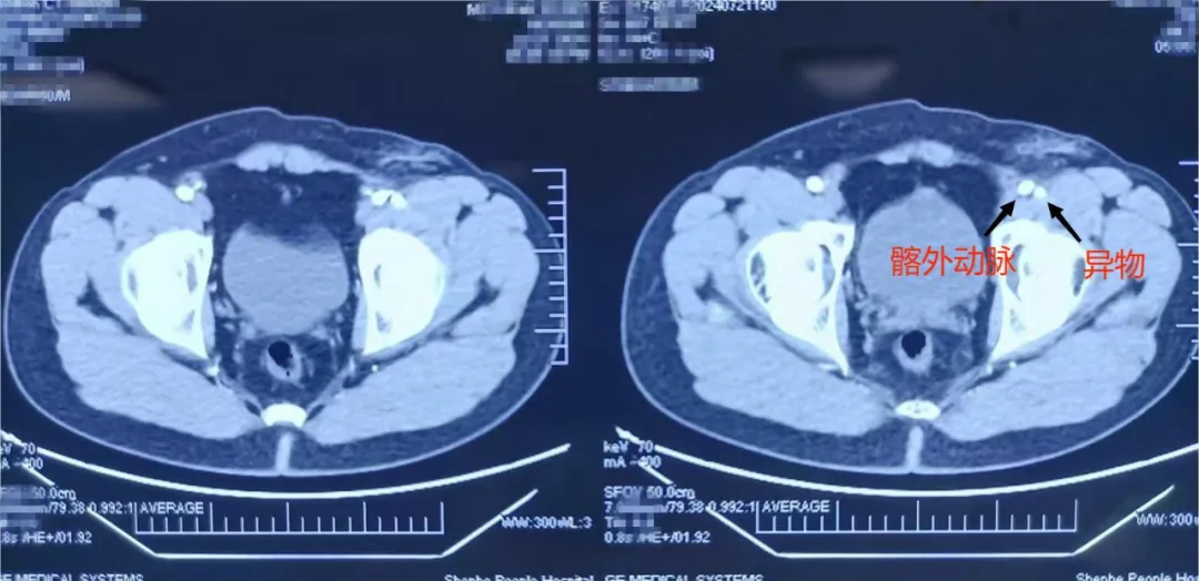 工厂同事紧急将他送往当地医院,当地医院完善骨盆X线片后,考虑铁片残留位置特殊,技术有限无法完成该类手术,于是又立即转到我市一所市级医院救治。该院完善盆腔增强CT检查后,发现异物十分靠近髂外动脉及股神经,相当于在血管神经周围存在一枚“定时炸弹”。该院认真研判患者病情后,认为如动脉搏动致铁皮割破血管及损伤神经,将严重危及患者生命,需立马行手术治疗,但考虑铁片非常靠近血管和神经,手术风险极大,最终建议转到我院治疗。面对这一突发状况,急诊医学科立即启动应急响应机制,医护人员迅速集结,准备迎接这场生命挑战。