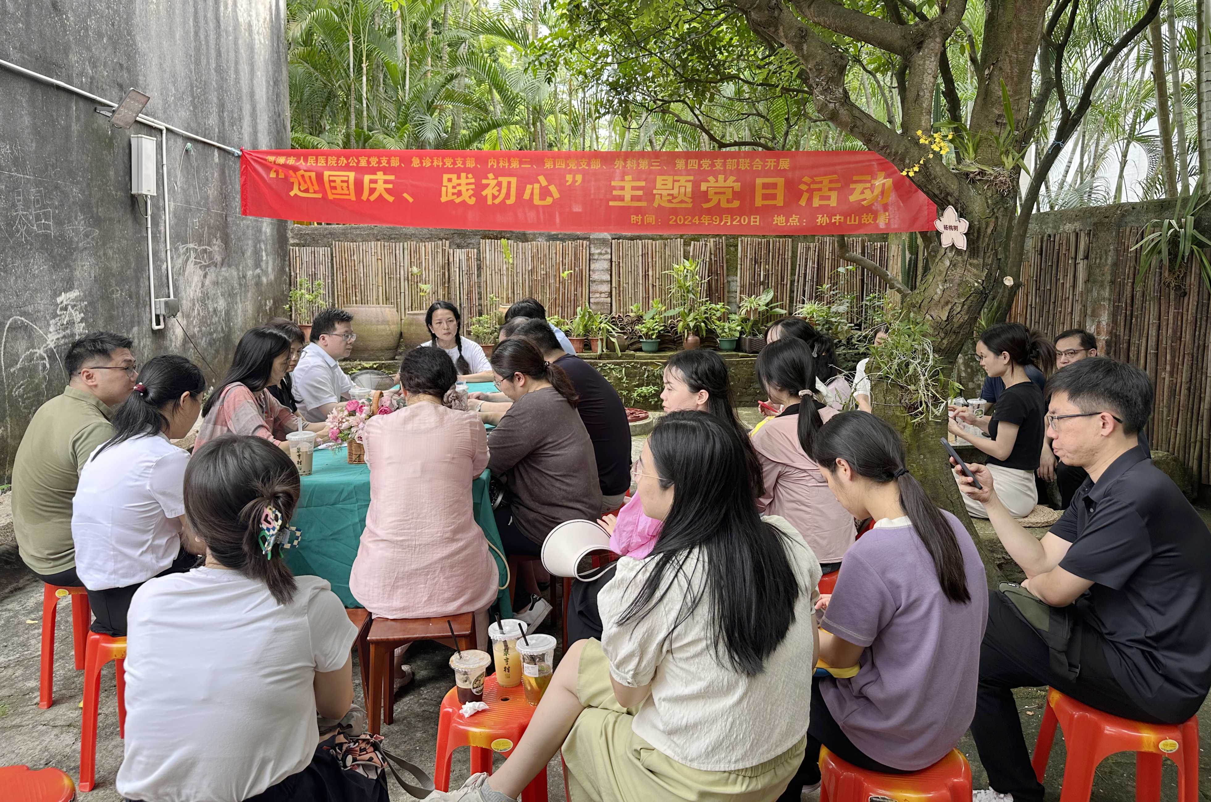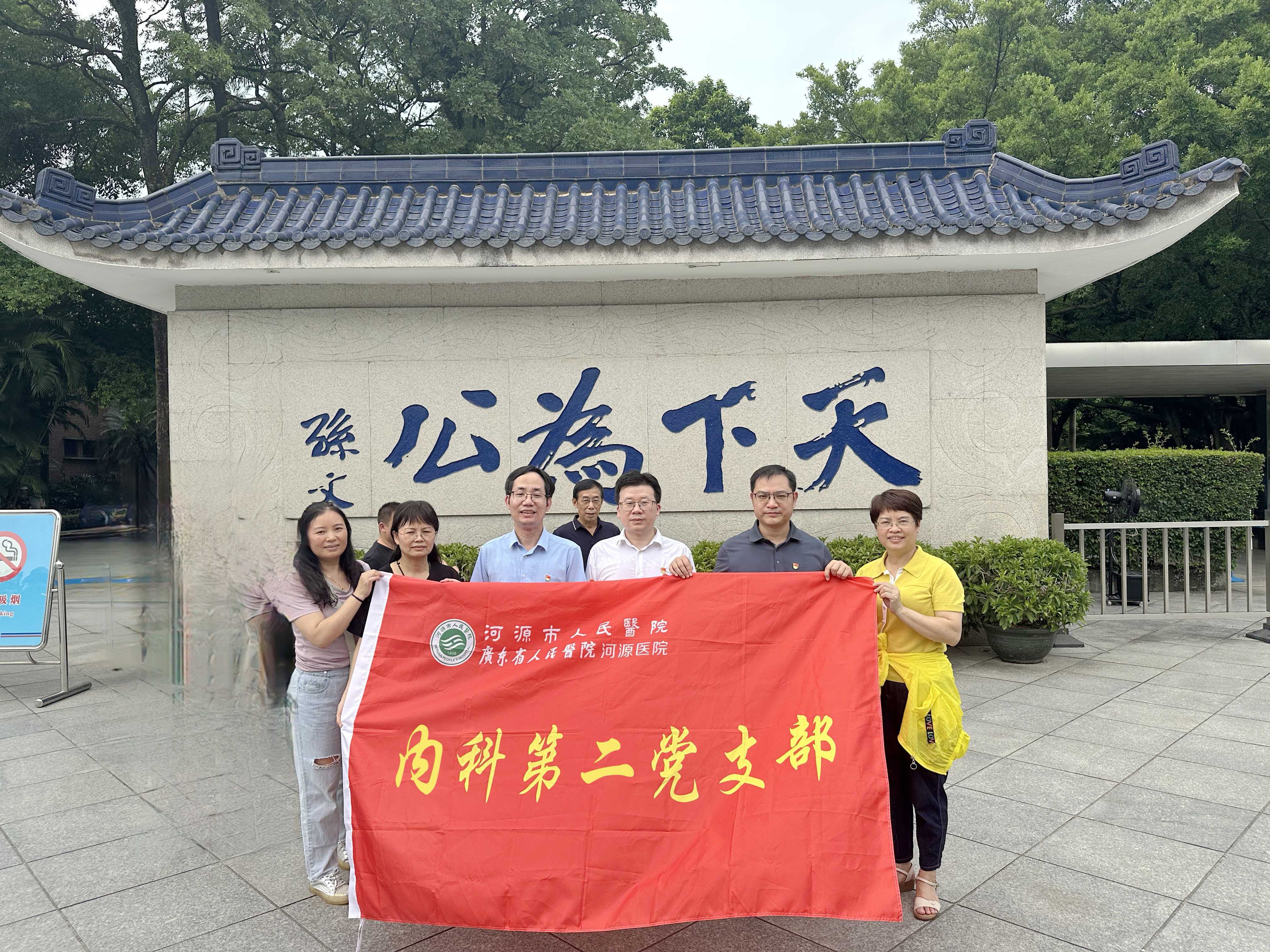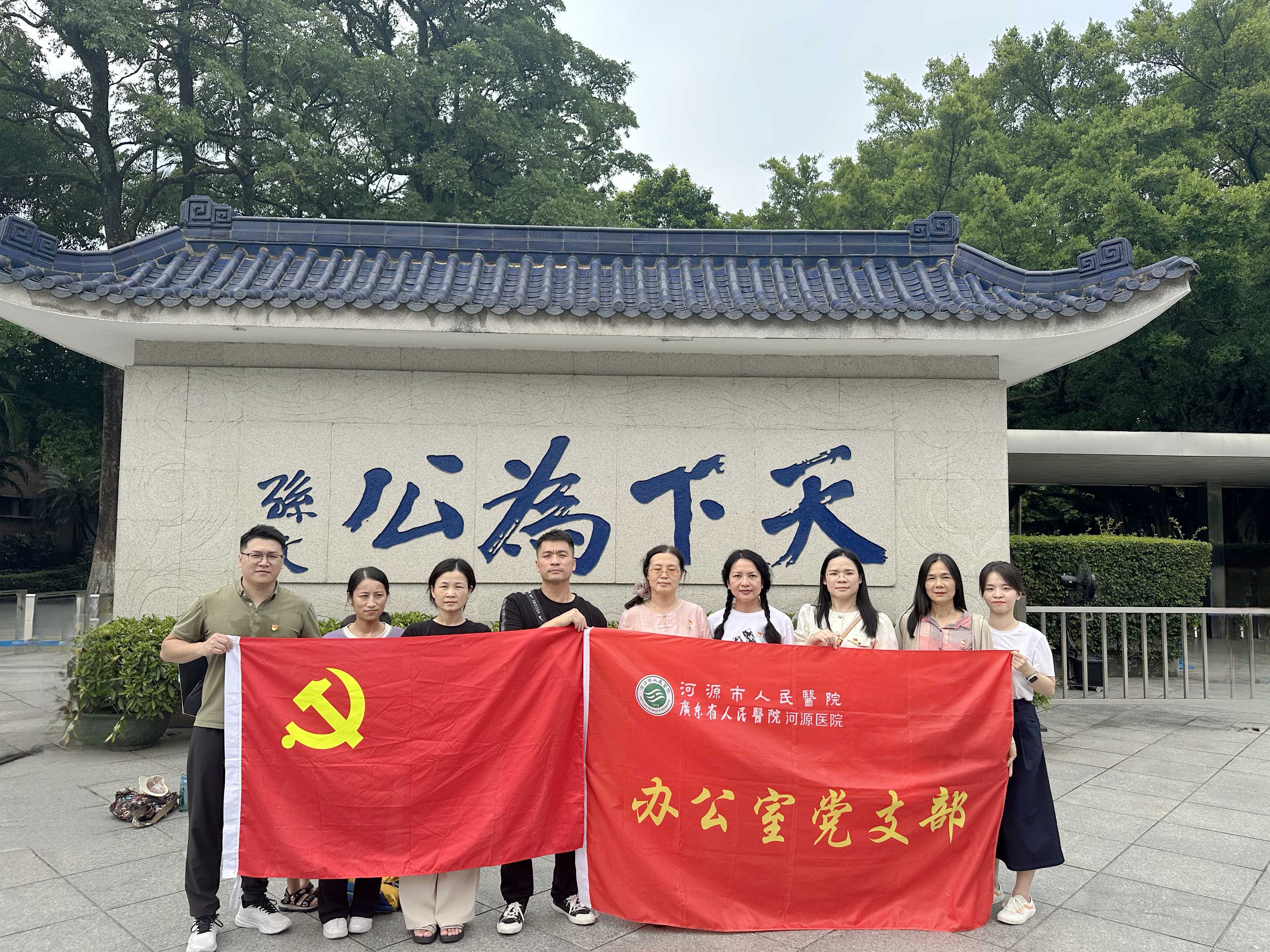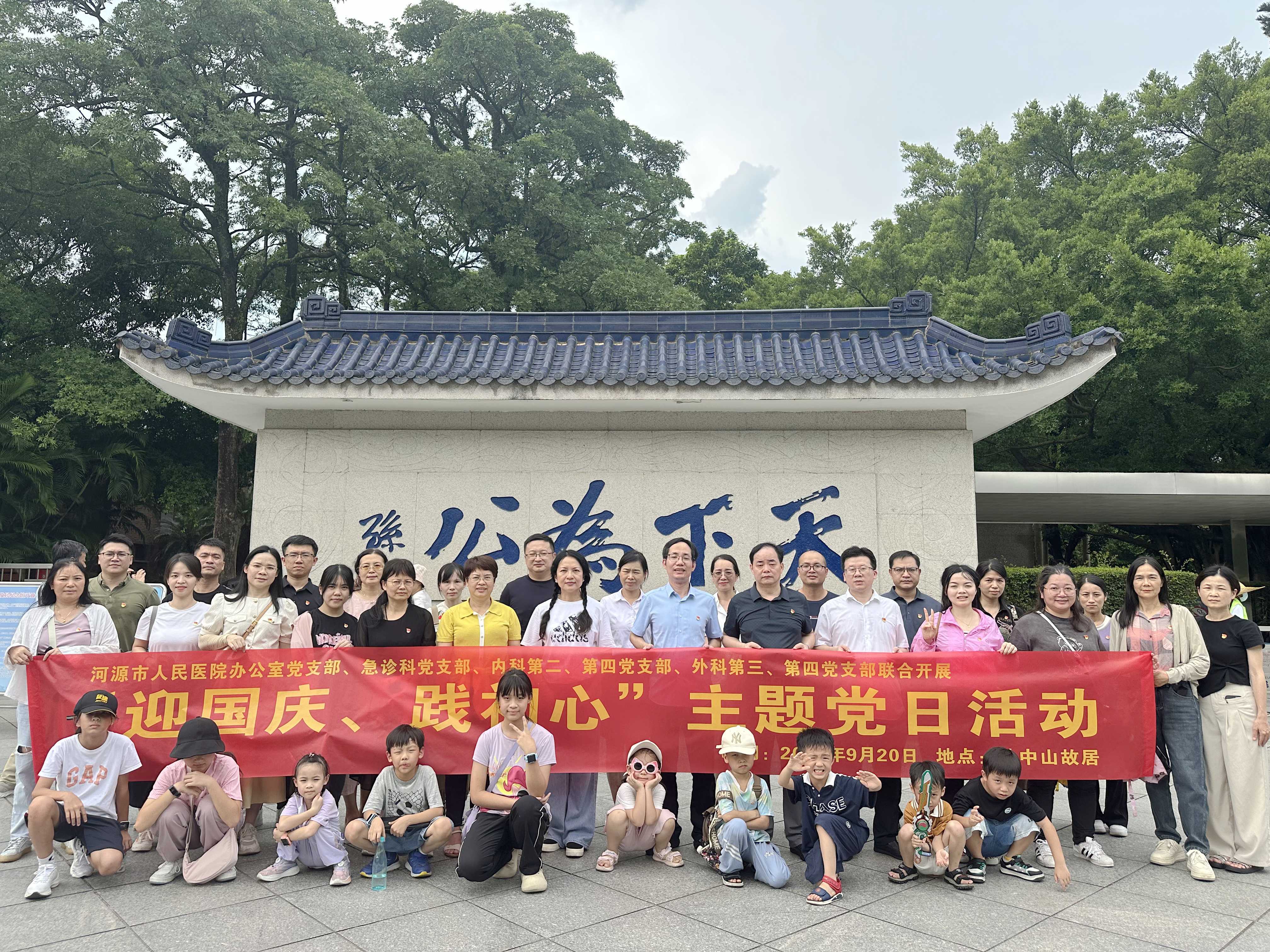 ▲我院办公室党支部、急诊科党支部、内科第二、第四党支部、外科第三、第四党支部及其家属在孙中山故居“天下为公”红色教育基地合照