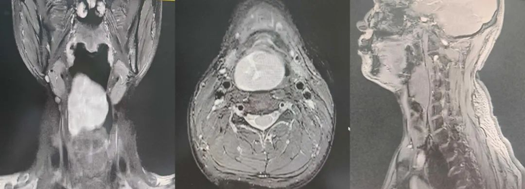 日前,39岁的杨先生近2年自觉讲话时如同口中含物,于1个月前体检时发现咽喉部巨大肿物,于是至我院就诊。耳鼻咽喉头颈外科主任王晓茜接诊后,给予患者纤维喉镜检查提示喉咽后壁巨大肿物,表面光滑,遮挡声门,建议住院手术治疗,入院后完善咽喉增强磁共振提示喉部巨大肿块,考虑神经鞘瘤或混合瘤可能。