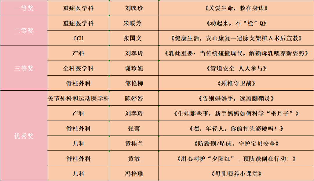 决赛过程中,选手们以专业的视角,通过生动的案例、深入浅出的讲解,将专业的医学知识转化成通俗易懂并兼具实用性和启发性的作品,内容囊括各科常见疾病健康指导、健康生活方式和疾病预防、慢病康复、现场急救等健康问题,通过现场讲演、短视频、MG动画、情景剧、脱口秀等多元化表演形式,让复杂、深奥的医学知识变得简单、易懂、有趣,充分展现了我院护理人员对健康科普工作的热情与创造力。其中重症医学科护理团队极富趣味和专业的情景剧表演“关爱生命,救在身边”将此次科普大赛推向新高潮。