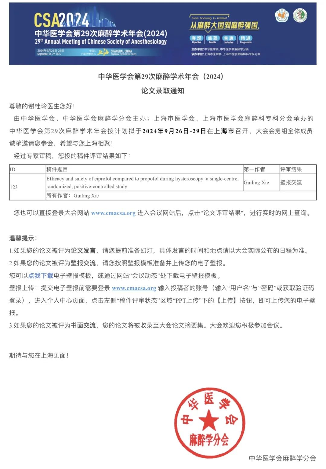 此次年会中,由我院麻醉科主治医师谢桂玲所撰写的论文《Efficacy and safety of ciprofol compared to propofol during hysteroscopy: a single-centre, randomized, positive-controlled study》被此次大会收录为“壁报交流”。