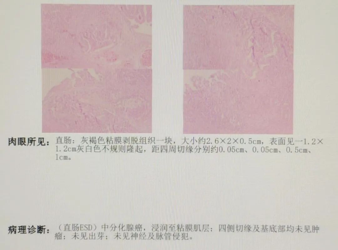 患者术后组织病理提示直肠中分化腺癌,浸润至粘膜肌层,未见肿瘤出芽、脉管内癌栓及神经侵犯,侧切缘及底切缘干净,未见肿瘤累及。这样病人就不需要追加外科手术治疗,相对于传统外科手术,生活质量明显提高。当然,内镜保肛的对象必须是早期肿瘤,如果直肠肿瘤到了进展期,甚至晚期,则需要外科就诊,评估手术;具体如何选择,一定要和内镜医师详细沟通,认真听取内镜主诊医生建议。