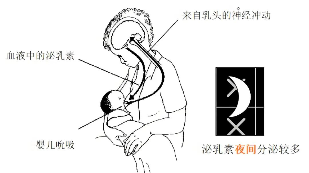 1.出生后立即与母亲肌肤接触的健康新生儿有能力自主寻乳,此时乳房易于含接和练习,初乳量也与新生儿的胃容量相匹配,早期频繁有效哺乳有助于母乳喂养的顺利开启。婴儿的吸吮刺激乳晕下未梢神经,传到下丘脑后垂体分泌泌乳素(促使乳腺生产乳汁)和催产素(促进喷乳反射),婴儿再通过口腔负压吃到奶(手挤奶,吸奶器也是模拟这个过程)。