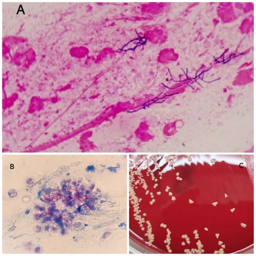 ▲A:痰涂片革兰染色G+杆菌;B:弱抗酸染色阳性;C:痰培养3天诺卡菌菌落