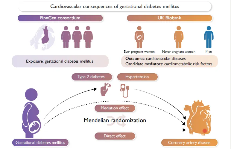 该研究由何鹏程院长团队与医学大数据中心、南方医科大学公共卫生学院生物统计学系、中南大学湘雅三院团队合作,首次基于大队列数据和性别特异性遗传数据,发现妊娠糖尿病的遗传基础与冠状动脉粥样硬化心脏病风险之间存在潜在的因果关联,而非妊娠糖尿病与冠状动脉粥样硬化心脏病共享遗传责任,并指出这种关系主要通过高血压和2型糖尿病这两种可调节的心血管代谢风险因素介导,研究结果为预防有妊娠糖尿病史女性发生冠状动脉粥样硬化心脏病提供了新的科学依据,可能有助于降低有妊娠糖尿病史女性的心血管疾病风险。