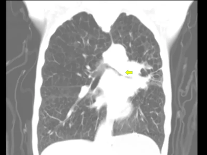 ▲左肺门-纵隔肿块(黄色标记狭窄区域)