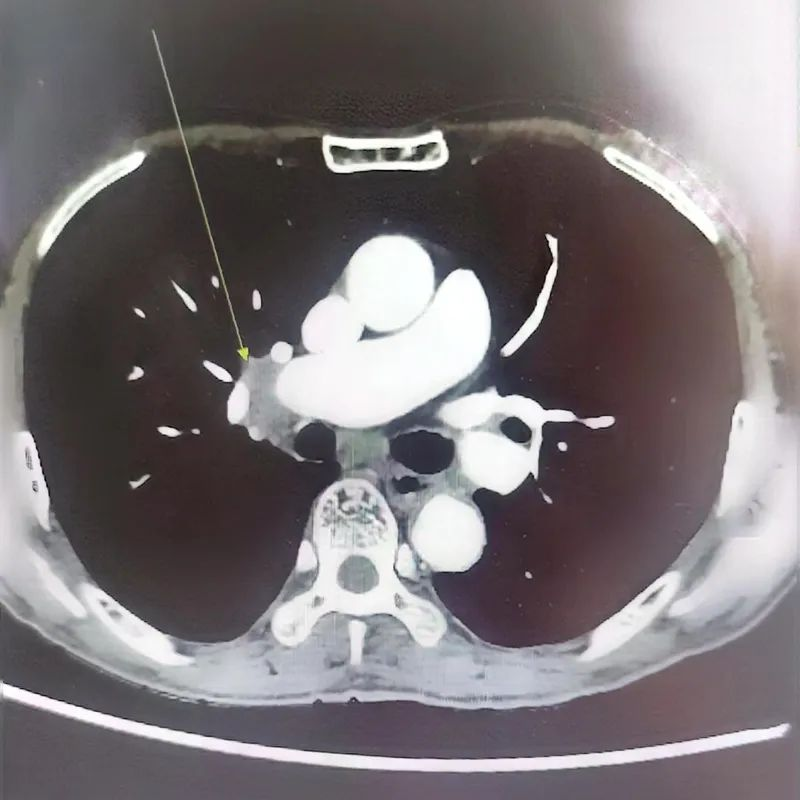 患者66岁,男性,重度吸烟,在我院住院治疗,首次诊断为右肺腺癌T3N2M0 IIIB期,驱动基因野生型。患者为局部晚期肺腺癌,为此组织了第一次肺癌MDT,考虑患者肿瘤大,与血管关系密切,纵隔淋巴结肿大,肿瘤完全包绕右上肺、中肺动脉,手术难度极大、未能实现完全切除(R0切除),复发率高,故MDT专家意见:根据最新国际研究进展,先行新辅助治疗后再行评估。为此,患者接受了3疗程的免疫治疗+化疗,复查CT示肿瘤显著缩小,达到部分缓解(PR)。家属欣喜地说“本来对化疗非常抗拒,担心老父亲会承受不了,但出于对医疗组的信任,坚持给父亲选择最好的方案。才发现目前的化疗不会像老百姓想象中的恐怖,就是打3-4个小时的针水,做好定期抽血,老父亲也没有出现严重副作用,能吃能睡。看到肿瘤缩小很欣慰。”