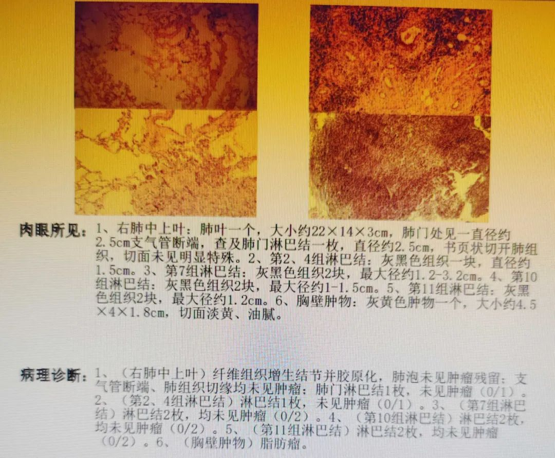 为此,胸外科张广云主任医师团队近日为该患者完成了微创胸腔镜下右中上肺叶切除加肺门、纵隔淋巴结清扫术,手术耗时3小时顺利完成,术后患者恢复良好,第二天即可下床活动。最终,手术后病理提示为切缘未见癌细胞,原发肺肿瘤及清扫的多站淋巴结均未见癌细胞(即获得病理完全缓解PCR)。目前患者已康复顺利出院。