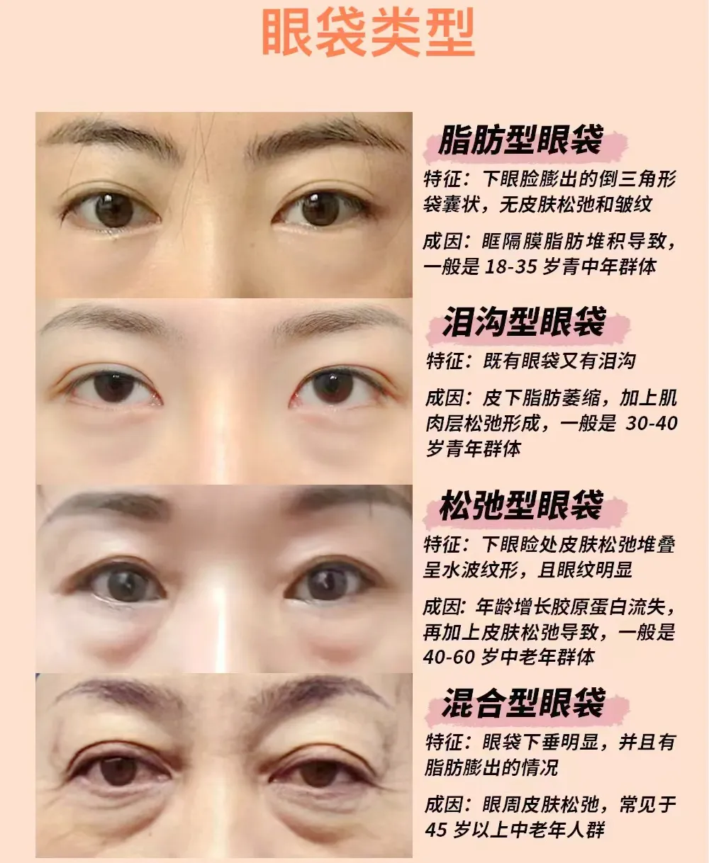 目前常见的眼袋类型可分为脂肪型眼袋、泪沟型眼袋、松弛型眼袋、混合型眼袋。