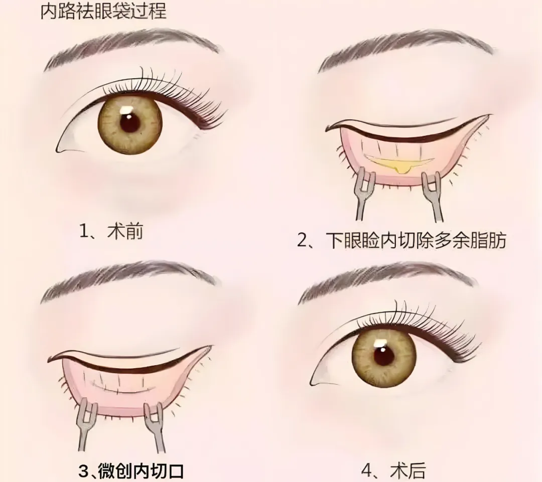 1.内路眶隔释放法:在下睑的结膜做微创切口,然后把眼袋脂肪释放转移,铺平泪沟位置。特点:无需缝合,不需要拆线,痛苦小,恢复期短,3-5天左右就大致恢复正常了。比较适合先天性因素造成的眼袋。