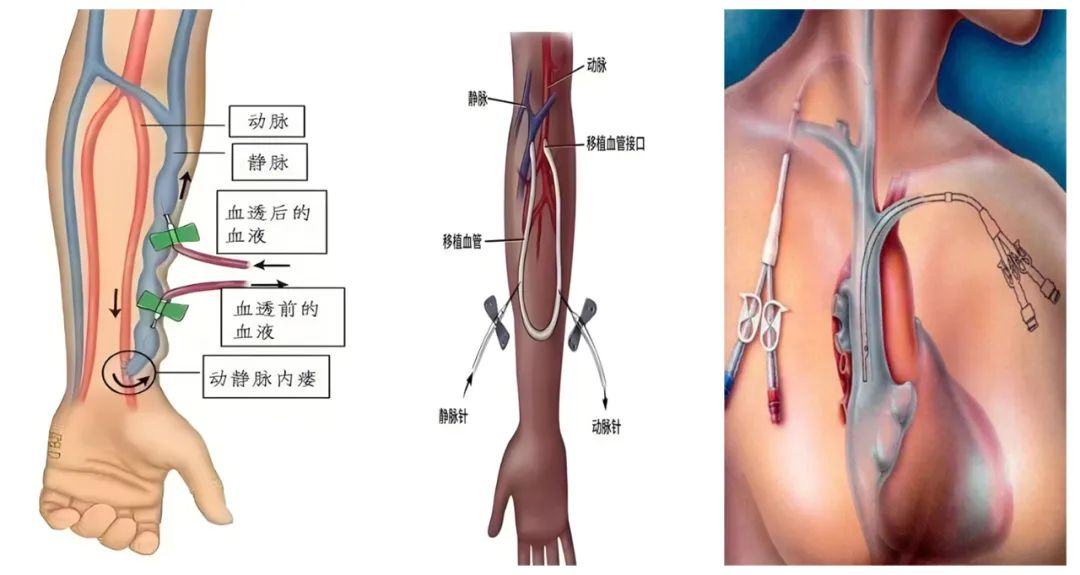 ▲血管通路示意图(左一为自体动静脉内瘘;中间为人造血管;右一为半永久中心静脉导管)