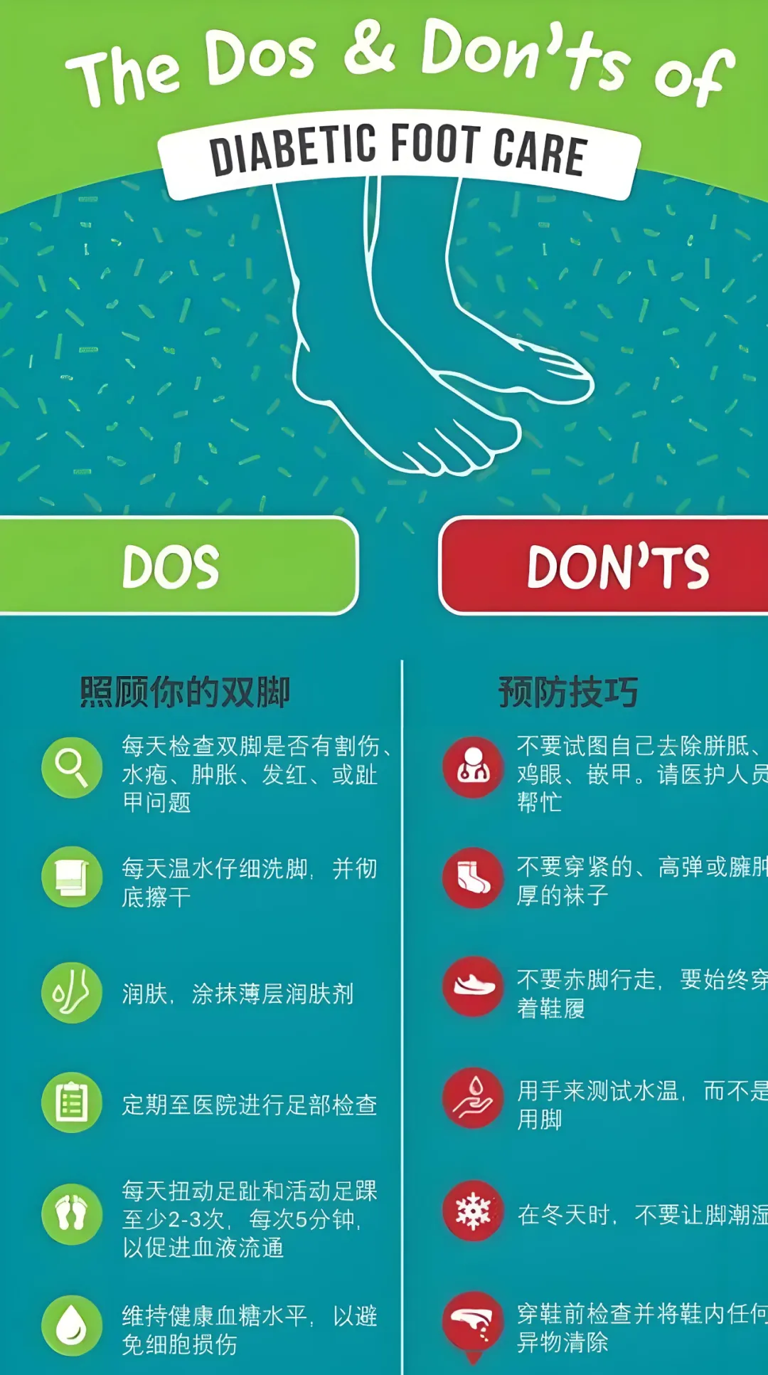 目前我国约有1.4亿糖尿病患者,美国糖尿病协会估计每5名糖尿病人中就会有1名因足部问题而就医,这说明糖尿病人更容易发生足部问题。糖尿病会损害神经和血管,使得损伤难以愈合或难以抵御感染,即使小的损伤亦会引起水泡或者溃疡,继而可能发生感染而导致截肢。所以足部日常护理非常关键,应该认真对待。