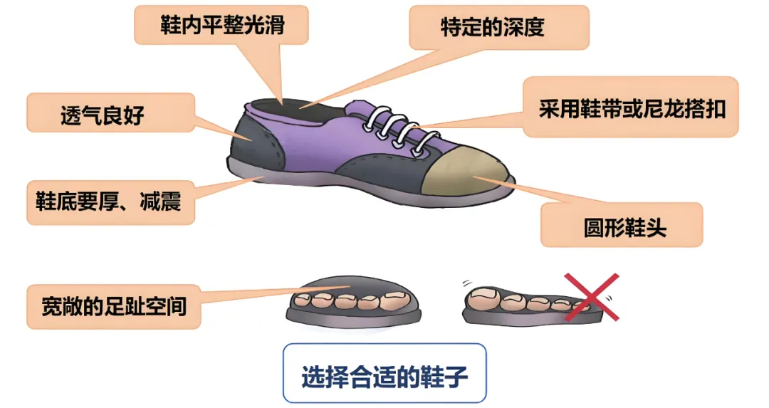 5.选择鞋袜要适宜。糖尿病足患者应首选透气性好、质地松软、大小合适的鞋袜。建议不要穿露出脚部皮肤的凉鞋或者拖鞋,避免皮肤裸露在外碰伤。也不要穿过紧的鞋或高跟鞋,以免给足部增加负担。