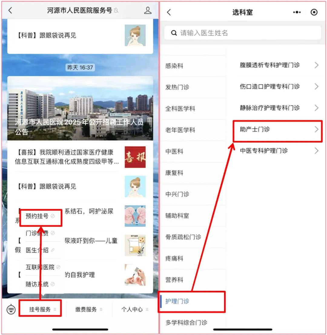 预约挂号方式:关注“河源市人民医院服务号”,点击挂号服务→预约挂号→院本部→护理门诊→助产士门诊,即可预约。