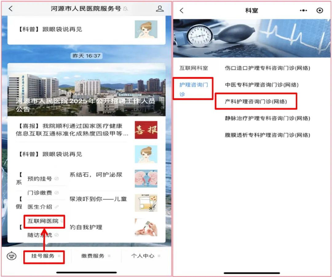 2.线上咨询:关注“河源市人民医院服务号”,点击挂号服务→互联网医院→咨询→护理咨询门诊→产科护理咨询门诊(网络)→添加就诊人→填写个人就诊信息→挂号,即可线上咨询。