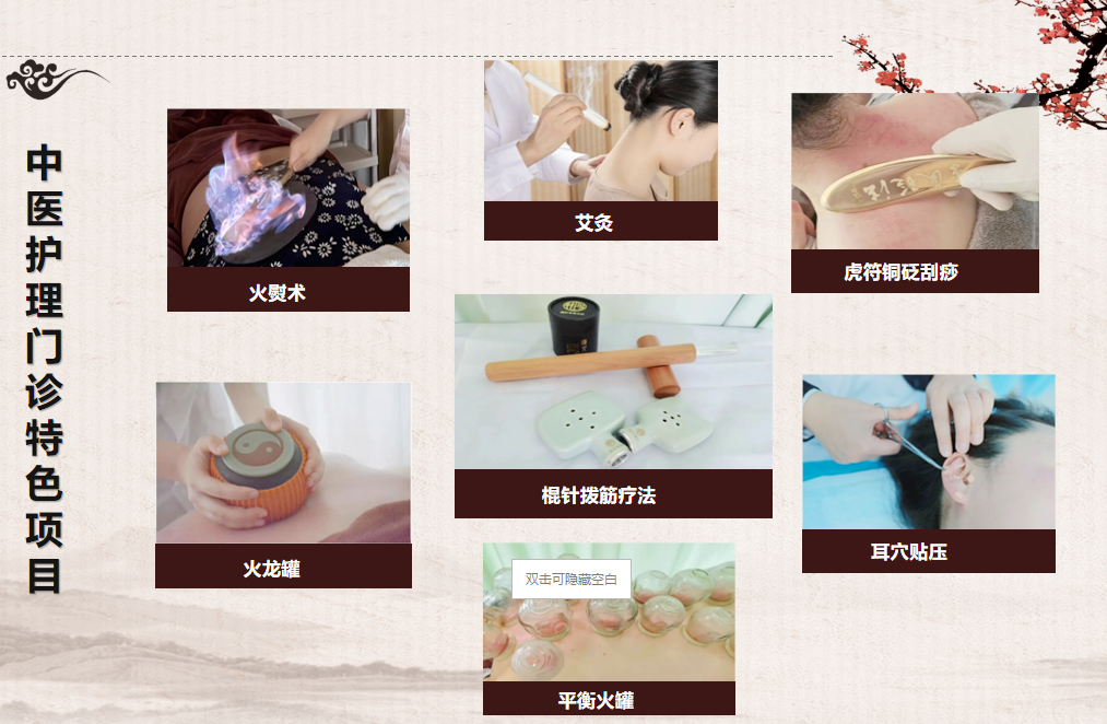 中医护理门诊目前主要开展项目:棍针拨筋疗法、火熨术、火龙罐、平衡火罐、虎符铜砭刮痧、温通刮痧、灸法、耳穴贴压等多项中医护理特色项目。对临床多种常见病如各种类型的疼痛、颈椎病、肩周炎、落枕、腰椎间盘突出、感冒、咳嗽、失眠、便秘、头痛、月经不调、慢性疲劳综合征、亚健康等疗效显著。