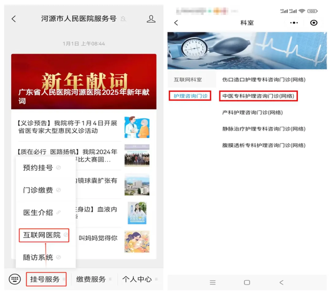 关注“河源市人民医院”服务号,选择挂号服务—互联网医院—科室分类(更多)—护理咨询门诊—中医专科护理咨询门诊(网络)进行咨询。